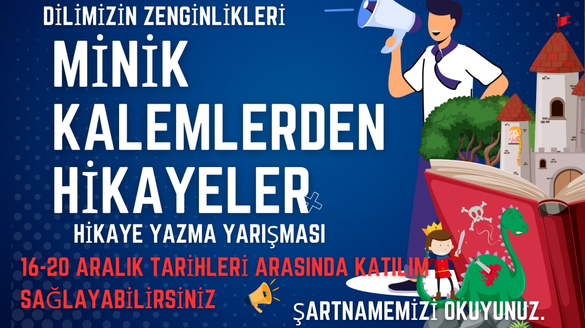 Dilimizin zenginlikleri projesi kapsamında okulumuzda " Minik Kalemlerden Hikayeler" isimli hikaye yazma yarışması düzenlenecektir. 3 ve 4. sınıf öğrencilerimiz 16-20 Aralık tarihleri arasında hikayeleri ile yarışmaya katılabilirler. Şartnamemizi okumayı unutmayın!